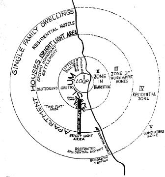 Burgess, Park's close colleague, proposed a systematic application of this general ecological theorizing in his concentric zone model of urban growth (Burgess, 1925). Burgess used the city of Chicago as a concrete illustration of his graphic model, which is shown below. This model divides urban areas into five concentric zones based on typical patterns of land use for commercial or residential purposes. Zone I, the central business district or Loop in Chicago, is restricted to commercial uses, whereas Zones III-V are residential areas, ranging from a Zone of Workingmen's Homes to the suburban Commuters' Zone. Zone II, the Zone in Transition, is a mixed area, where low-rent, slum residences are being replaced by businesses and factories.