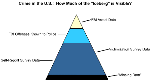 Sources of Evidence and the "Iceberg" of Crime For years, criminologists who studied the rate and distribution of crime in the United States had to rely on official data originally collected by law-enforcement agencies for their own bureaucratic purposes. For instance, ecological researchers at the University of Chicago during the 1920s collected most of their data from police arrest records and records of the juvenile court as they attempted to describe the distribution of criminals and juvenile delinquents throughout the urban area. Official arrest data had, and continue to have, some obvious limitations. As a measure of the extent of crime in the city, even the Chicago Sociologists realized that arrest data only measured the "tip of the iceberg." For one thing, most crimes are never "cleared by arrest"--that is, offenders are never caught in the majority of common crimes such as theft and assault. Furthermore, offenders who are caught and arrested may be atypical in many respects as compared to offenders who manage to elude police and escape arrest. In other words, the great bulk of offenders and offenses which remain in the "hidden part of the iceberg" may quite different from those "known to police." Official data on arrests will tend to reflect the biases or political motives of law-enforcement agencies, in that police may tend to target certain kinds of people (e.g., "racial profiling") or certain areas (such as low-income communities) in their routine arrest practices. It is always important to remember that an arrest is an act of social control rather than an act of deviant behavior. Thus, the arrest data at the tip of the iceberg of crime may tell us more about the nature of social control than about the nature of crime and criminals. Starting in the 1930s, the Federal Bureau of Investigation began collecting a second type of data--offenses known to police--which would provide a more extensive view of the total volume of crime in the United States. The FBI distributed questionnaires to local law-enforcement agences that asked them to report the number of violent offenses and property crimes that had come to their attention during a given period of time. This source of evidence was called the Uniform Crime Reports (UCR) because the questionnaires used standardized or "uniform" definitions of criminal offenses to insure that the responses of different law-enforcement agencies would be consistent and, therefore, comparable. The annual publication of national data from the UCR , which include data on arrests as well as offenses known to police, is greeted with a great deal of press coverage and political attention. Changes in national or regional rates of UCR offenses known to the police are often treated by the news media, politicians, and other claimsmaking groups as the primary measure of whether the crime problem is improving or getting worse. And, yet, UCR offenses known to police only shed light on a bit more of the "iceberg" of crime than do arrest data. The UCR data do not, of course, reveal anything about crimes "unknown" to police, where victims neglected to report the incident to the police or where the police failed to "officially record" an incident. In fact, changes in rates of crimes known to police may have as much or more to do with changes in the reporting practices of victims or the police than they do with changes in the underlying rate of offending. As a consequence, social scientists involved in the study of crime and delinquency have developed other measurement techniques that reveal still more of the iceberg of crime in the United States or in smaller settings like school districts. In the pages that follow, we will take a brief look at two other sources of evidence on the extent and distribution of crime: victimization survey data and self-report survey data. Each of these survey techniques is capable of measuring criminal behavior that has never come to the attention of the police. We have already discussed two examples of the self-report survey, the Monitoring the Future study of self-reported drug use by high-school seniors and the national survey of domestic violence reported in Behind Closed Doors (Straus et al. 1980). Because the latter study also asked respondents to report incidents where they themselves were victims of violence, the research of Straus et al. serves as an example of the victimization survey as well. Since the early 1970s, the Bureau of Justice Statistics and the U.S. Census Bureau have been conducting the National Crime Victimization Survey (NCVS), which is designed to provide a nationally representative estimate of the total rate of criminal victimizations in the U.S. We will examine some of the findings of this important source of evidence on officially unreported crime. However, as shown in the diagram below, even the best designed self-report or victimization surveys will still be vulnerable to some missing data resulting from problems of sampling bias (e.g., kids not attending school when the survey was administered) or invalidity due to misreporting of deviant acts (e.g., failure to disclose spouse abuse). Thus, although we will be never be able to examine the entire iceberg of crime, we can now use self-report and victimization surveys to explore far beneath the superficial view of crime and criminals provided by data on arrests. |