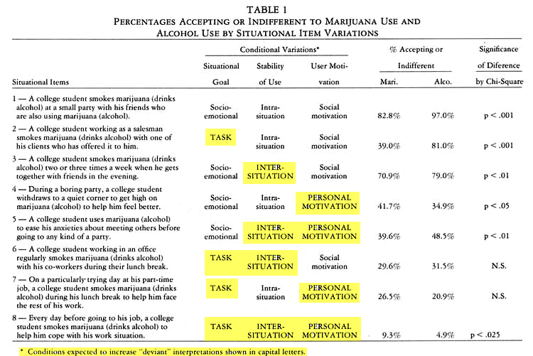 Situational Variations in the Acceptability of Marijuana and Alcohol UseOne of the main interests of researchers in the labeling tradition is analysis of how situational context affects social interpretations of problematic behavior. In a very real sense, no actbe it homicide, drinking, or drug usecan be adequately interpreted as deviant or non-deviant without the framework of meaning provided by situational circumstances. For instance, depending on situational context, the act of taking another person's life can be variously interpretated as murder (a "drive-by" shooting), as heroism (killing the enemy in combat), or as doing one's job (excuting a prisoner on Death Row). In an assigned reading on "Deviance as a Situated Phenomenon" (Orcutt 1975 in Pontell, Social Deviance, pp. 247-254), student respondents were asked to interpret the acceptability or unacceptability of marijuana use or alcohol use in various hypothetical situations. Situational circumstances were systematically varied according to three conditions that should affect interpretations of substance use as deviant or as nondeviant. The first of these conditions relates to situational goals and varies according to whether drug use occurs in a task situation or in a socioemotional situation. The use of either marijuana or alcohol should generally be perceived as consistent with the goals of a socioemotional situation, such as a party, but as a potential source of interference with goal-attainment in a task situation. Therefore, the acts of marijuana use or alcohol use will tend to be interpreted as deviant when situated in a task setting. The situational stability