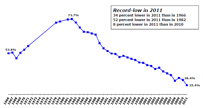 College Drinking Has Also DecreasedThere is also little evidence of increases in alcohol use or deviant drinking among college students over the past few decades. To the contrary, an annual survey of first-year college students known as the Cooperative Institutional Research Project (CIRP) conducted by the Higher Education Research Institute (HERI) has recorded a steady decline since 1982 in the percentage of freshmen who drink beer occasionally or frequently. The graph below, which depicts the declining longitudinal trend in "occasional" or "frequent" beer drinking among college freshmen, is adapted from a website sponsored by the brewers of Budweiser and other popular brands of beer, the Anheuser-Busch Companies: http://www.alcoholstats.com. Examine this graph closely. You will notice that the y-axis (which is not labeled) has been truncated at about 30 percent. Why do you suppose the y-axis doesn't start at zero, like the Monitoring the Future graphs shown above? In other words, how does the decision by the designer of this graph to focus only on the upper part of the y-axis affect the appearance of the downward trend in beer drinking by college students? If you want to see additional results from the CIRP survey of first-year college students, more information is available at the following HERI website: http://heri.ucla.edu/PDFs/pubs/TFS/Norms/Monographs/TheAmericanFreshman2011.pdf |