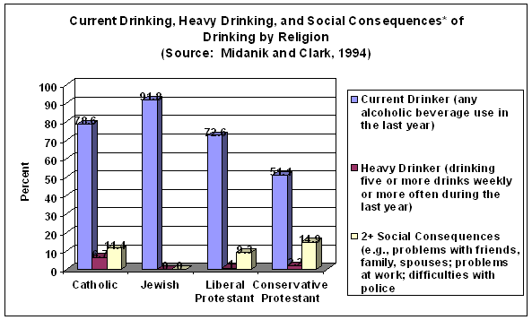 The results for Jewish respondents are remarkable. Whereas over 90 percent of this group are current drinkers, none of them met the criteria for heavy drinking (i.e., five or more drinks weekly or more often during the past year). Furthermore, none of the Jewish respondents experienced two or more social consequences from drinking. Thus, alcohol problems appear to be virtually non-existent among Jewish drinkers. Some sociologists have described Jewish drinking culture as being "prescriptive" in nature, in that Jews learn a variety of rules and practices about alcohol, mostly wine, from an early age. These shared prescriptive understandings about alcohol provide Jewish drinkers with clear guidelines and limits that effectively regulate and constrain their drinking behavior. Midanik and Clark's findings for conservative Protestants differ substantially from the Jewish results as well as from the results for liberal Protestants. First, only slightly more than half of conservative Protestants are counted among current drinkers, which is not surprising in light of the prohibitionist stance of the groups included in this category. Yet, a higher percentage of conservative Protestants are heavy drinkers (2.2 percent) than are liberal Protestants (1.0 percent). Even more dramatically, almost 15 percent of the conservative Protestants encountered problematic social consequences because of their drinkinga rate of social consequences that exceeds even the heavier drinking Catholic group. This result, of course, reflects the strong social reaction to deviant drinking in the so-called "proscriptive" culture of conservative Protestants. Even if Protestants are generally less likely to drink than other groups, they are more likely to be labeled as deviant if they should happen to cross the proscriptive normative boundary of this culture and begin to drink. It is also likely that they know less about how to handle alcohol and limit their consumption than do drinkers from more prescriptive cultures. Because of their ethnic and cultural diversity, Catholic drinking patterns are difficult to characterize. Some predominantly Catholic groups, such as Italian Americans, are somewhat similar to Jewish Americans in that they are quite likely to drink, at least occasionally, but they are particularly likely to develop drinking problems. However, Irish Catholics in the old country and in the U.S. have relatively high rates of alcohol problems. Similarly, German Catholic groups tend to be heavy consumers of beer and other alcoholic beverages. On the whole, Catholic and liberal Protestants fall between the other two groups in prevalence of current drinking and social consequences. |